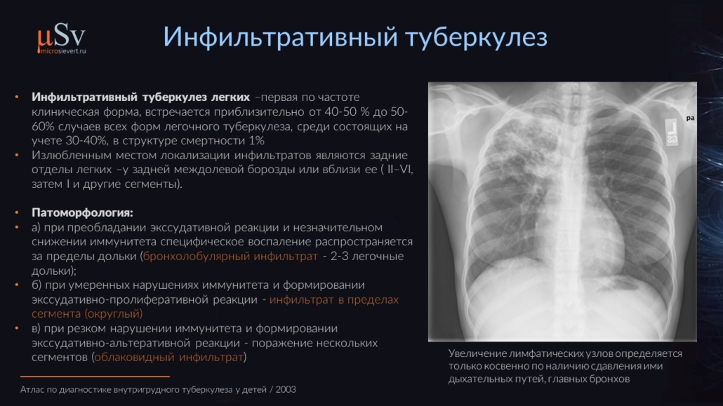 Часто встречаемая форма: типы инфильтратов (бронхолобулярный, округлый, облаковидный, лобит), их патоморфология, исходы и диагностические критерии.